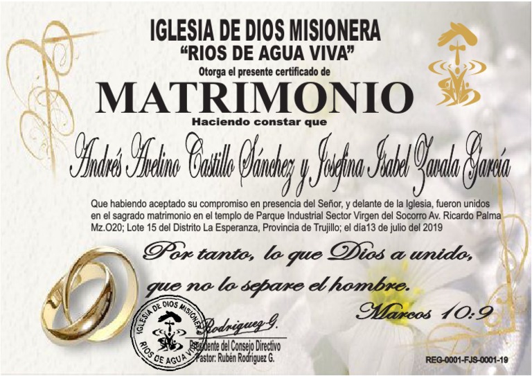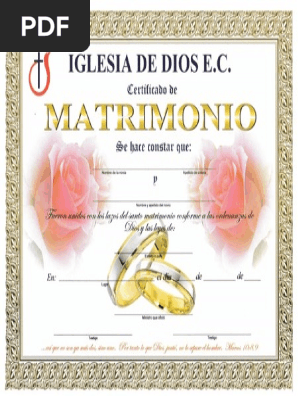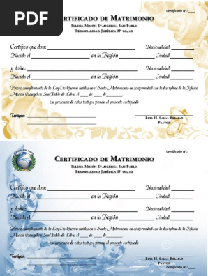 Certificado de matrimonio pdf. Atractivos certificados de matrimonio a todo color para dejar constancia y testimonio de un matrimonio de acuerdo a las Escrituras. Es un requisito el presentar un Certificado de Matrimonio Religioso para un proceso de nulidad Toda la información pertinente se encuentra abajo. Se informa de que a partir de septiembre de 2021 este servicio será sustituido progresivamente por el nuevo servicio de solicitud de certificados de Registro Civil para el que será necesario identificarse con Clave o certificado electrónico.