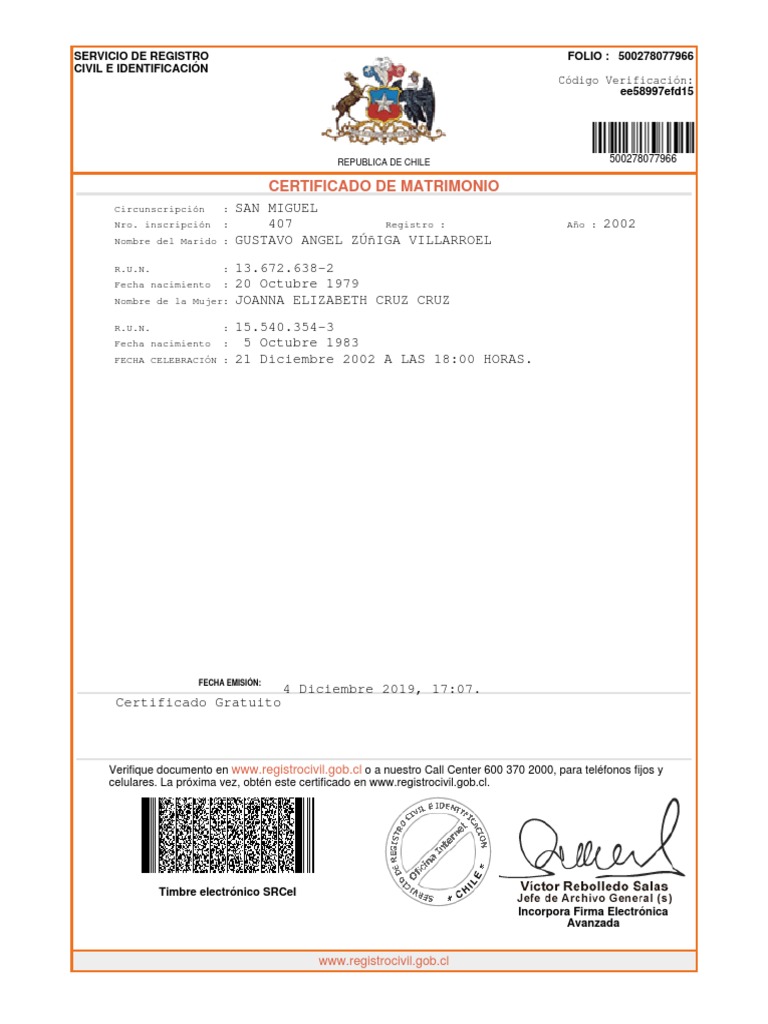 Certificación de Matrimonio. Estimado a usuario a con el fin de proteger sus datos personales para la obtención de certificados de nacimiento matrimonio yo defunción se requerirá el RUN y el Número de Documento del solicitante de conformidad con la ley 19628 sobre protección de la vida privada. EXTRACTO LITERAL NEGATIVA RECOGIDA DEL CERTIFICADO Ordinario o bilingüe Plurilingüe FINALIDAD PARA LA QUE SOLICITA EL CERTIFICADO.