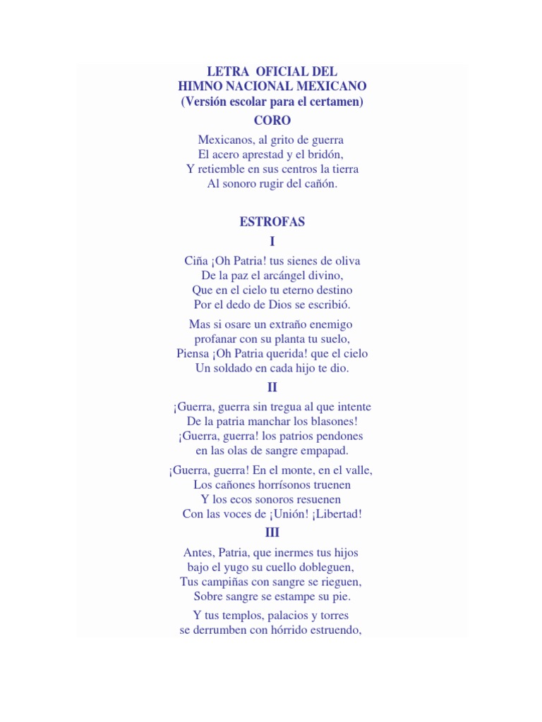 Este karaoke esta sincronizado con la pista numero 3 del cd que Secretaria de Educacion dio a todas las escuelas de Nuevo Leon y es la que se uriliza en los. El himno nacional. Letra himno nacional mexicano para imprimir Después de la independencia y el establecimiento del régimen republicano México necesitaba un canto patriótico que uniera la conciencia de los ciudadanos.