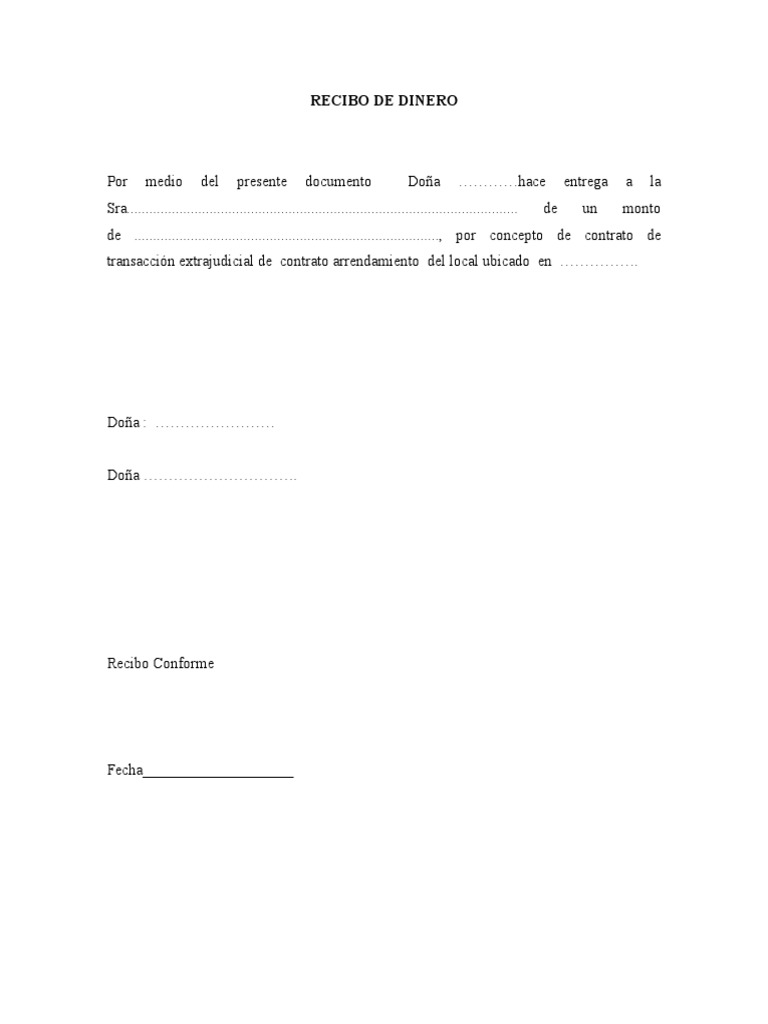 El recibo de dinero es un documento que sirve para que una persona manifieste haber recibido cierto monto de dinero de otra por algún concepto determinado. El recibo consta de dos partes. Tulio rodriguez paredes peruano independiente soltero con dni n.
