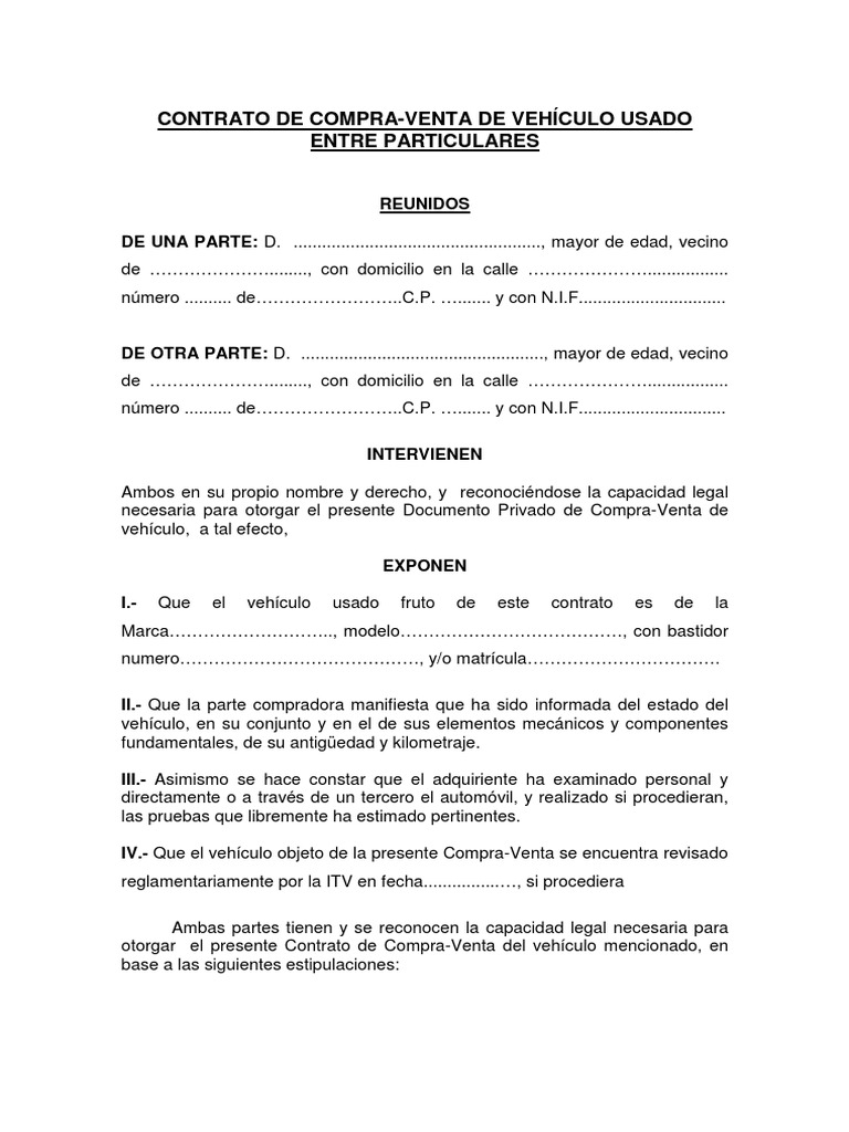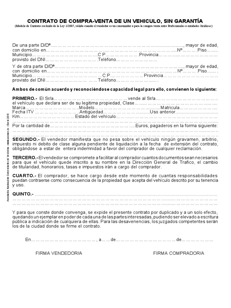 Documento compra venta coche. No obstante para que la venta sea un éxito y no aparezcan problemas en el futuro es importante fijar en el contrato de compraventa no solo la fecha sino también la hora en la que se produjo el trato. 2ª El vendedor declara que no pesa sobre el vehículo ninguna carga o gravamen ni impuesto deuda o sanción pendientes de abono a la fecha de la firma de este contrato comprometiéndose en caso. En un plazo no superior a _____ días desde la firma de este documento.