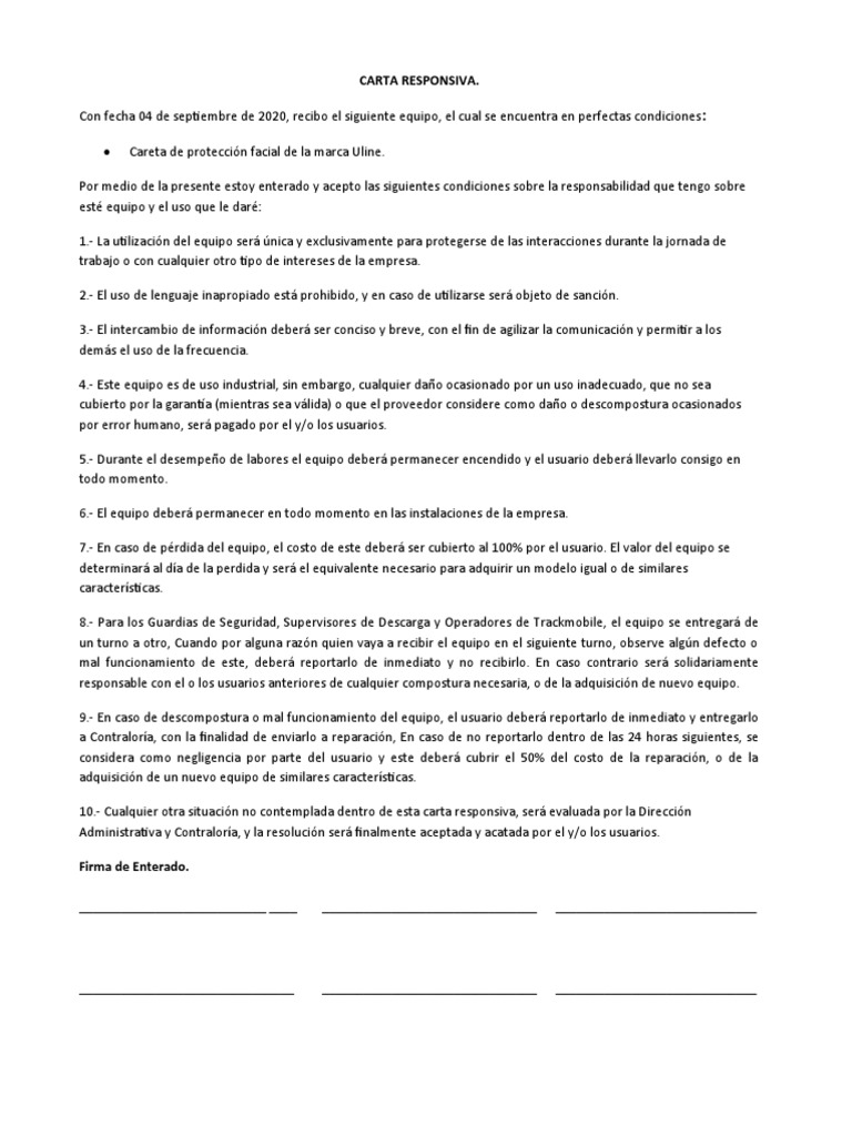 Formato Carta Responsiva Equipo De Trabajo