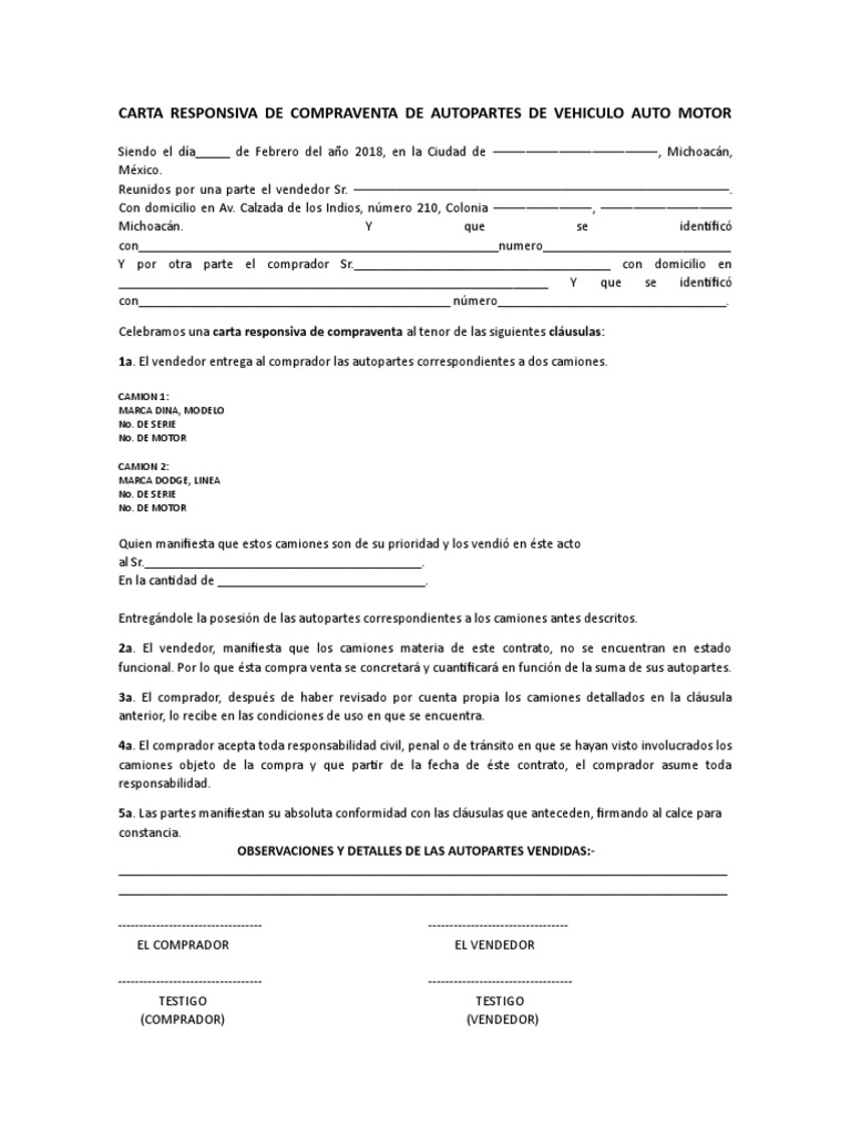 Carta Responsiva De Compraventa De Autopartes De Vehiculo Auto Motor Pdf Camion Vehiculos Terrestres