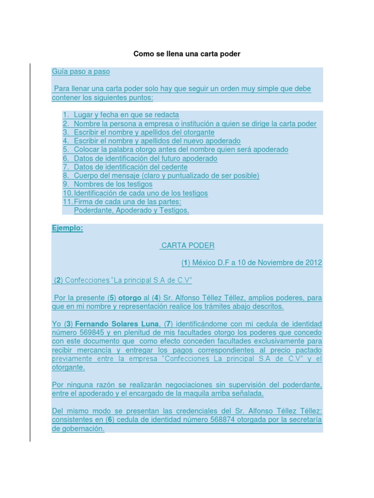 General Guía paso a paso Para llenar una carta poder solo hay que seguir un orden muy simple que. Ejemplo de Carta Poder Simple. CARTA PODER _____ Escriba lugar y fecha de expedición Escriba nombre completo de la personas o autoridad es ante las cuales se presentará la carta poder.