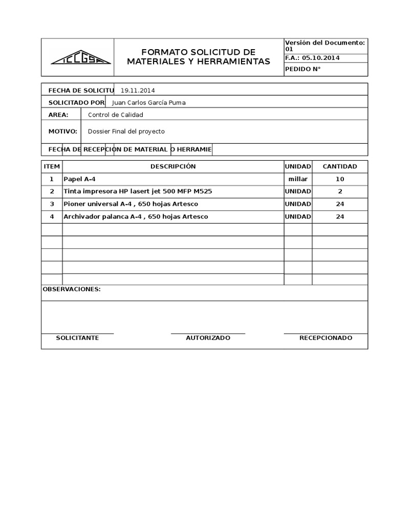 FORMATO SOLICITUD DE MATERIALES F13-9309- 00103-10 Versión 2. Fecha de Última Actualización. Los archivos de solicitudes como la solicitud de empleo a menudo suele estar estructurado en formato DOC para imprimir y modificar directamente desde aplicaciones de lectores de documentos.