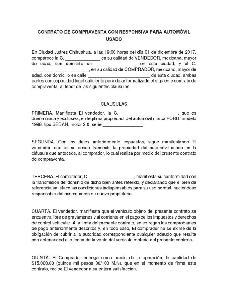 Contrato De Compraventa Con Responsiva Para Automovil Usado Gobierno Business