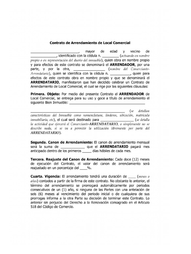 Si lo que te falta para rentar un predio es el Contrato de Arrendamiento de Terreno descarga nuestro formato PDF completamente gratis y personalízalo con tus datos. El Arrendatario declara de manera expresa que reconoce y acepta que este Contrato presta mérito ejecutivo para exigir del Arrendatario y a favor del Arrendador el pago de i los cánones de arrendamiento causados y no pagados por el Arrendatario ii las multas y sanciones que se causen por el. Formato de contrato de arrendamiento de local comercial La información presentada en este documento es únicamente de carácter informativo y en ningún momento debe considerarse completa correcta yo aplicable para todas las situaciones.