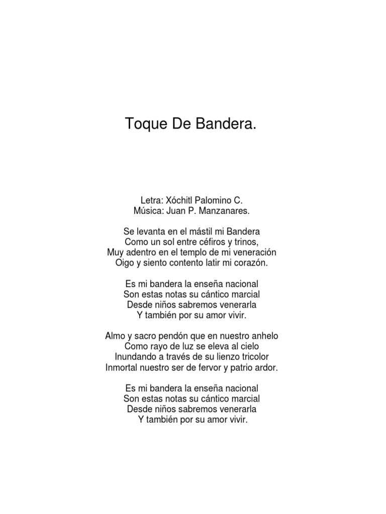 Toque de bandera letra. Recuerdo cuando niño esta canción me ponía los ojos llorosos tan solo de escucharla como olvidar esta patriótica pieza. Se levanta en el mástil mi Bandera Como un sol entre céfiros y trinos Muy adentro en el templo de mi veneración Oigo y siento contento latir mi corazón. La letra fue escrita por Xóchitl Angélica Palomino Contreras mientras que la música es obra de Juan Pío Manzanares.